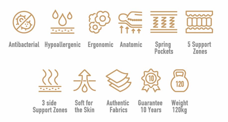 The combination of foam materials of different qualities and densities ensures the fluffy feeling and in combination with the independent springs of 8 zones (5 waist zones in the centre of the mattress and 3 zones around the perimeter) the correct body support is achieved. These features are highlighted by the modern design using luxurious and certified fabrics, detailed work that only befits a top quality mattress and high aesthetics. All you have to do is to confirm it yourself.